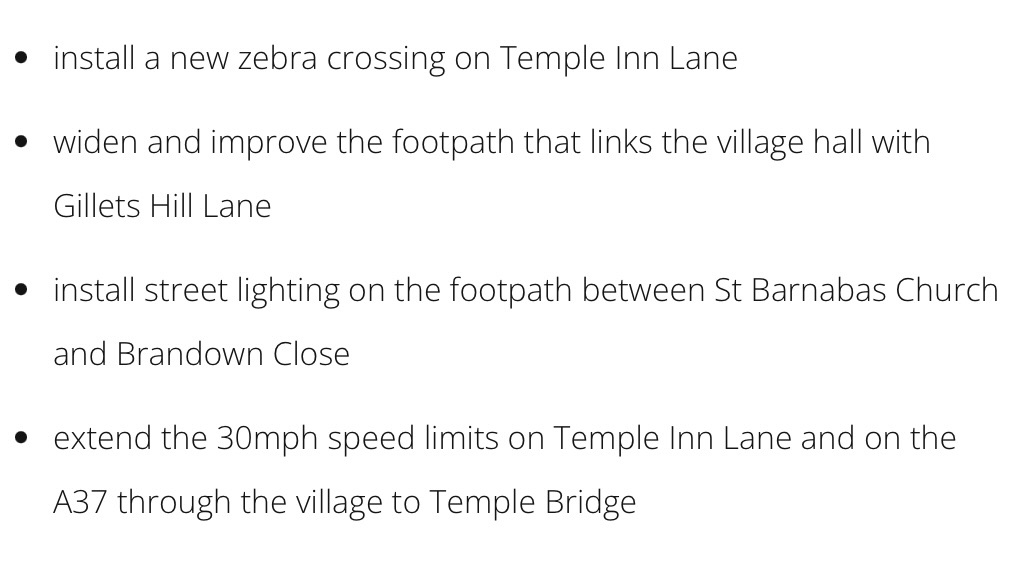 - (Plan pt 2) The zebra crossing on Temple Inn Lane will not address the problem of poor footpath provision on the A37. For pedestrians and cyclists to use the crossing they will still have needed to traverse the A37 in some way.