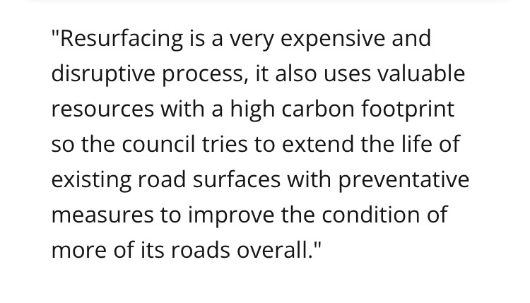 Crumbling road surfaces tolerated because “net zero”; whilst pothole sized tarmac patches are added to pavements.