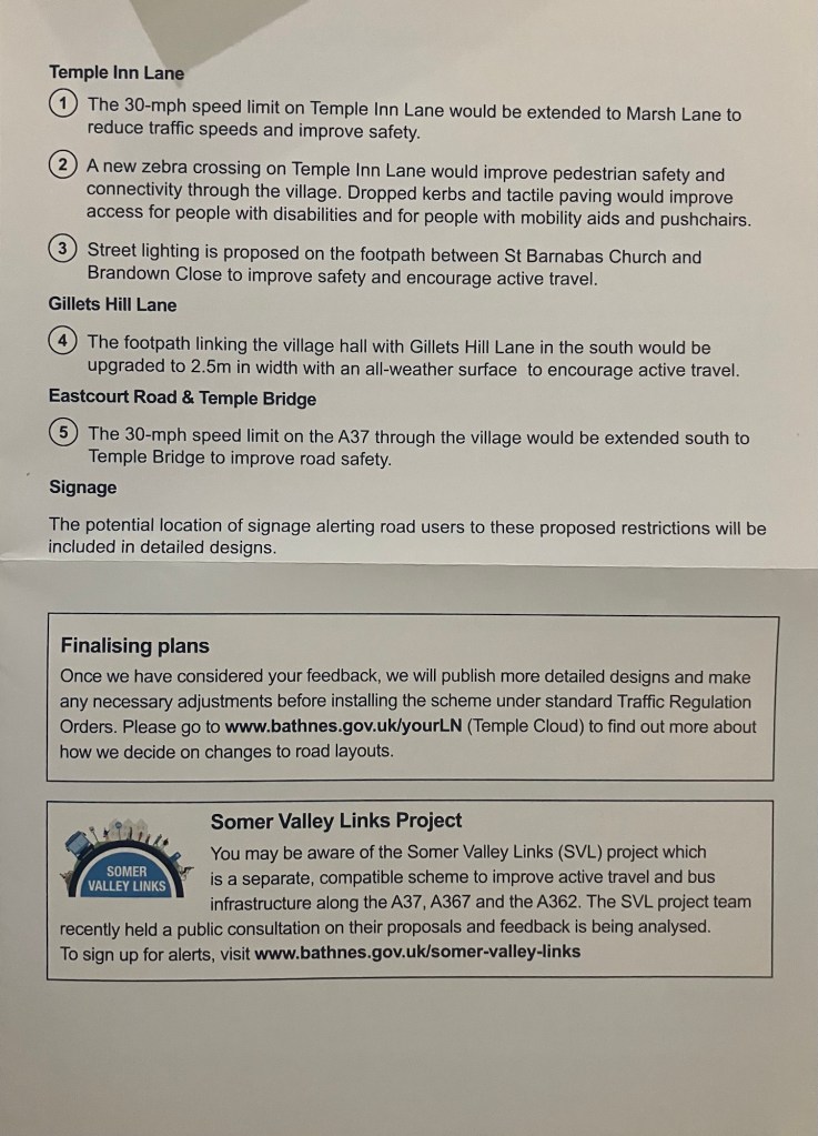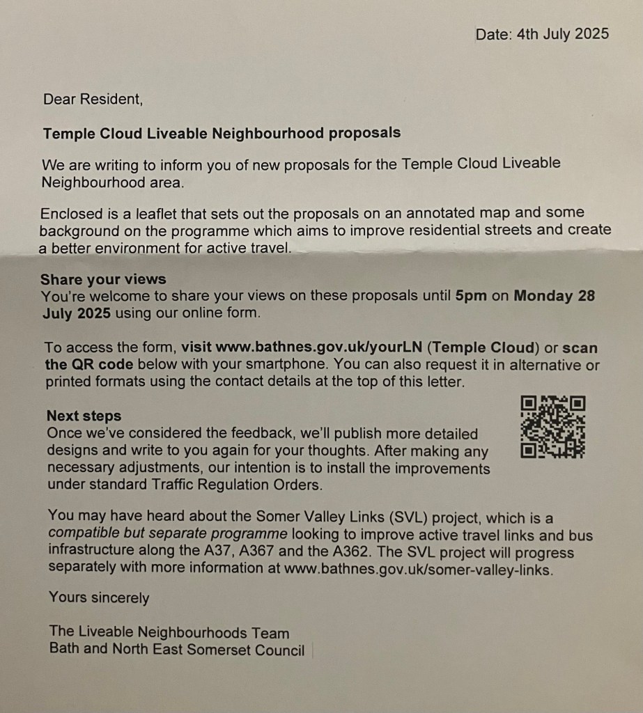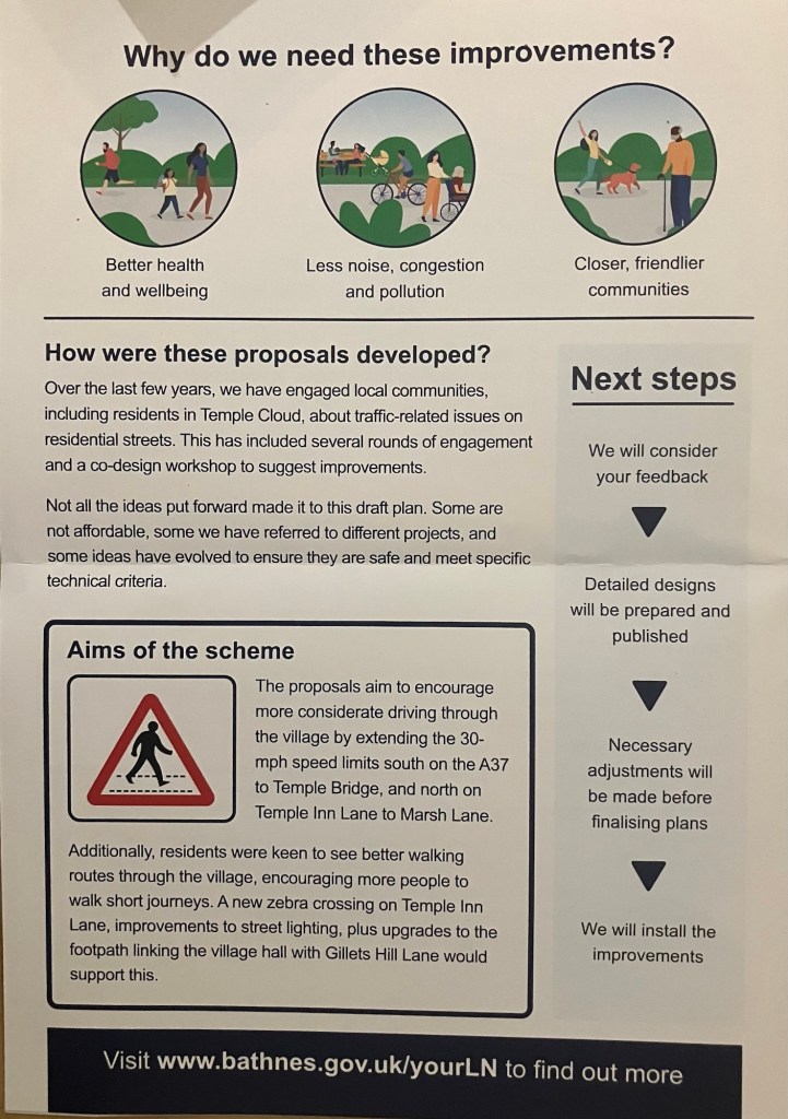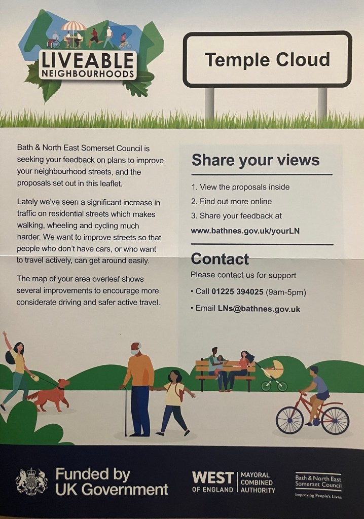 Quote taken from BaNES consultation… The liveable Neighbourhood plan for Temple Cloud is yet more evidence of anti-car policies by BaNES Lib Dem Council.