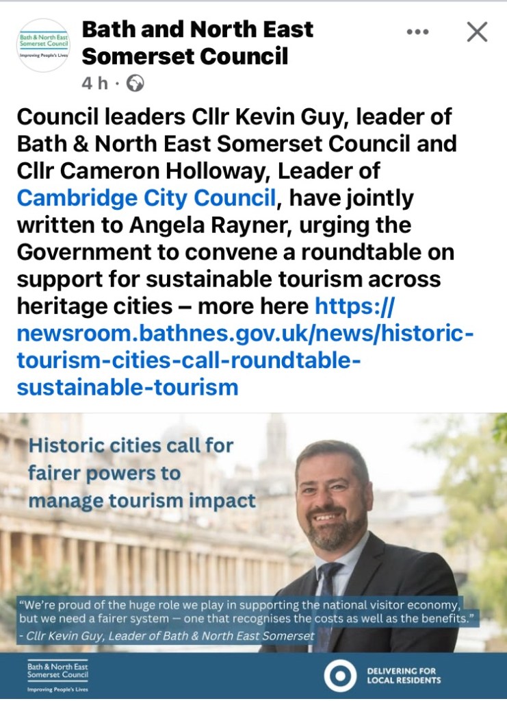 Cllr Kevin Guy, Leader of Bath & North East Somerset Council stated in his newsletter, “Yesterday, I convened a discussion with fellow council leaders, Cllr Susan Brown, Leader of Oxford City Council and Cllr Cameron Holloway, Leader of Cambridge City Council together with our Cabinet Member for Resources Cllr Mark Elliott (pictured). Both Cllr Brown and Cllr Cameron are from heritage-rich, destination cities like ours. These places welcome millions of visitors each year and, as a result, face significant pressures on infrastructure, public services and the public realm. Together, we’re calling on central government to recognise both the value we bring to the national visitor economy and the local costs we shoulder in doing so.