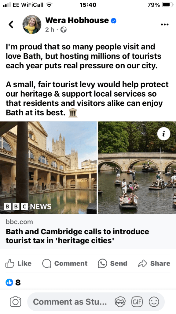 Be in no doubt, BaNES want a Tourist and Airbnb tax (short term lets). Meanwhile they’ll be making it more difficult and more expensive for tourists to enter the City and park…