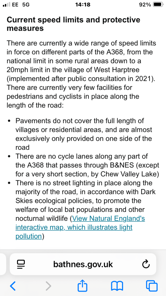 In the name of net zero and active travel speed limits across the ward, and on the arterial routes between the ward and Bristol and Bath, have been significantly reduced in another BaNES/Lib Dem attack on personal travel and freedom of movement.