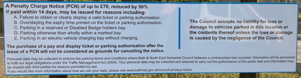 Between 0800-1800hrs BaNES allow 2hrs free parking. A car park that we pay council tax to operate and maintain but I digress.