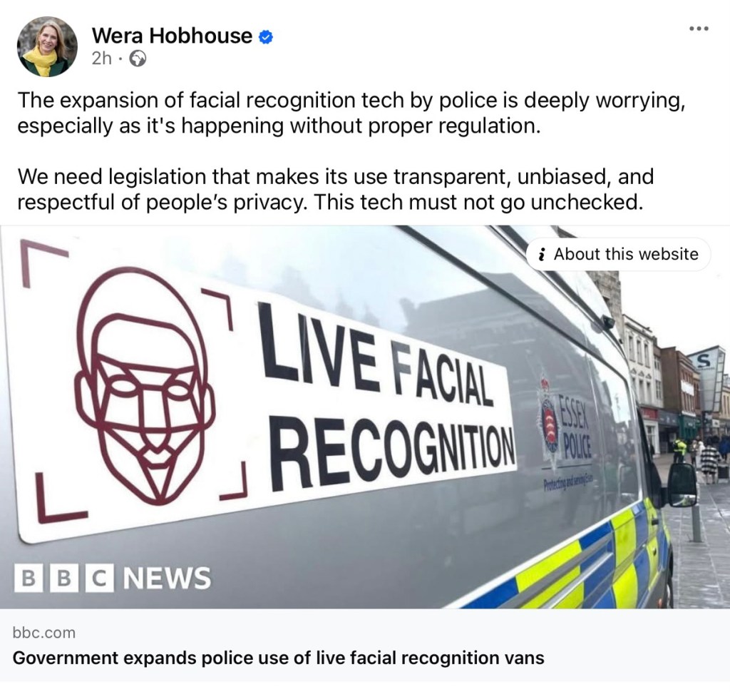 A rare moment indeed. I agree with my Lib Dem MP Wera Hobhouse 100%. Facial Recognition and other new surveillance technologies need reigning in and controlling asap.